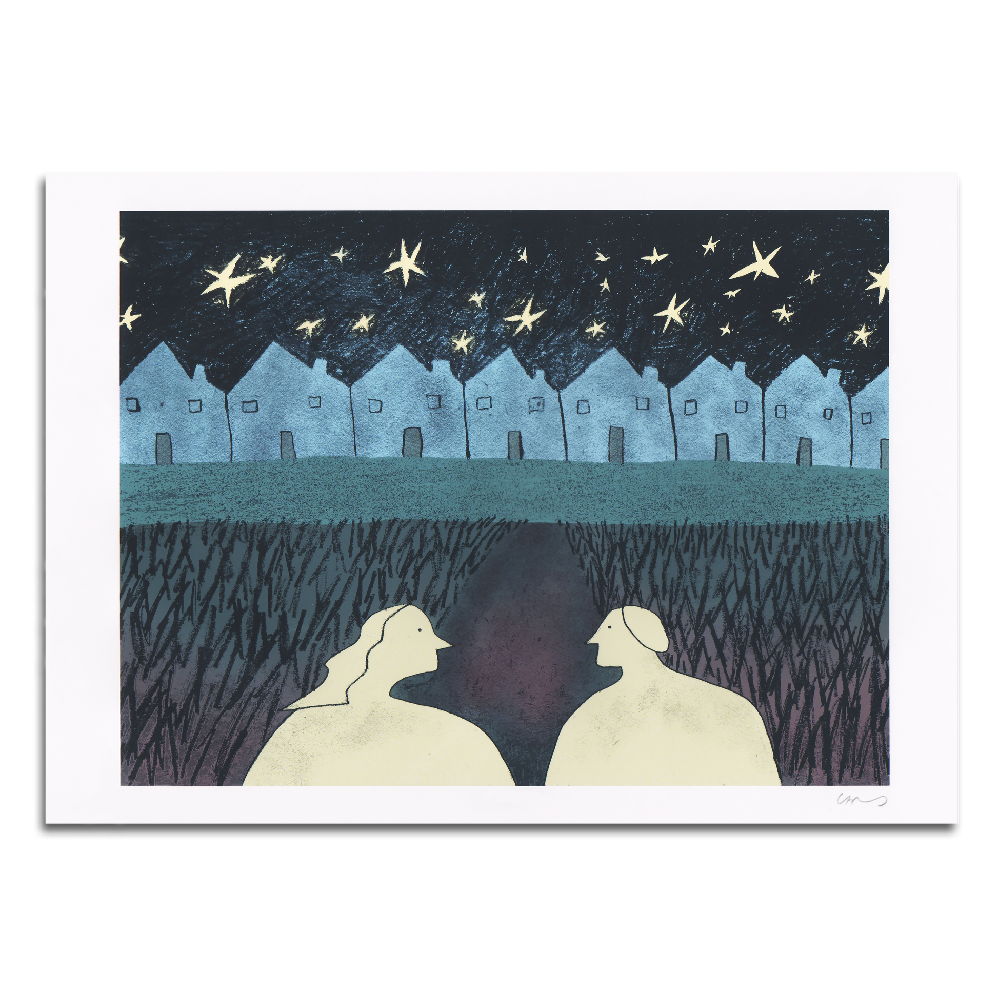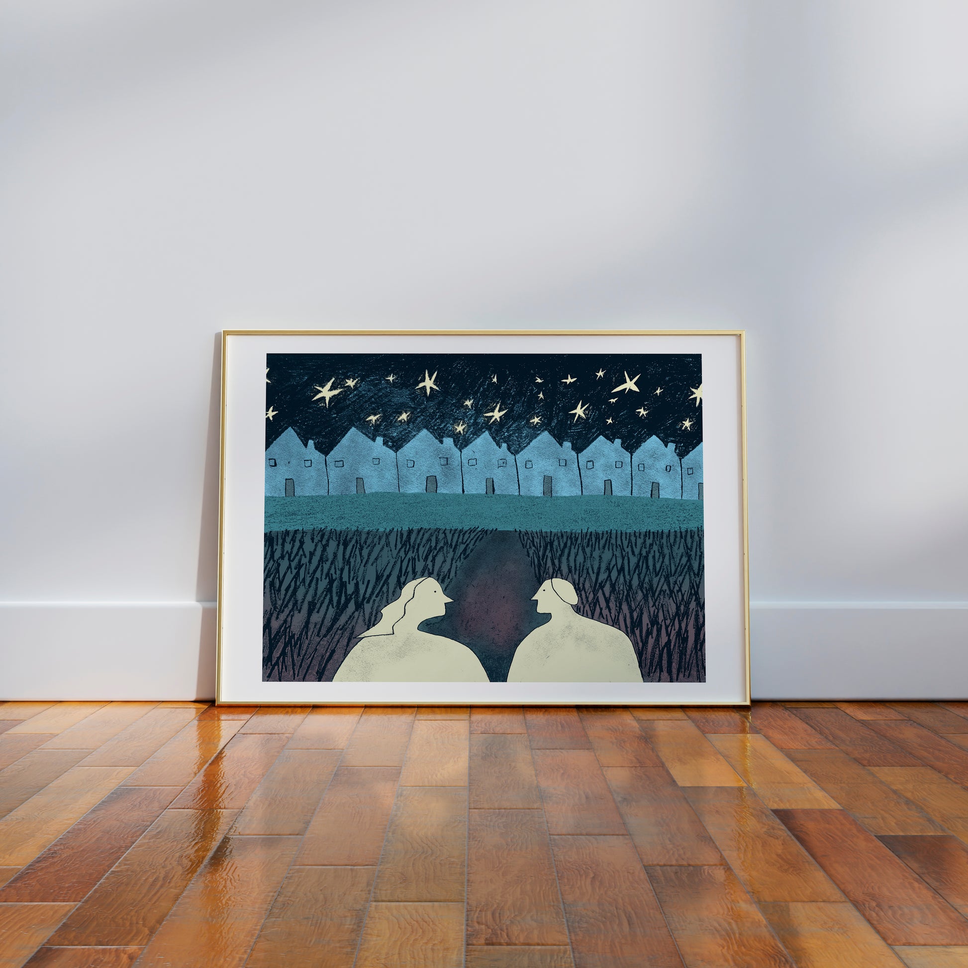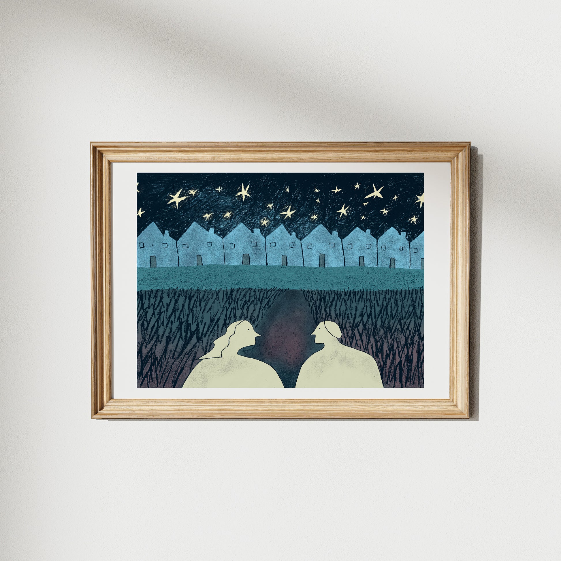 Accept this invitation to escape into the serenity of a starry night and the magic of connection. This print is a visual reminder that the best moments are often the simplest.