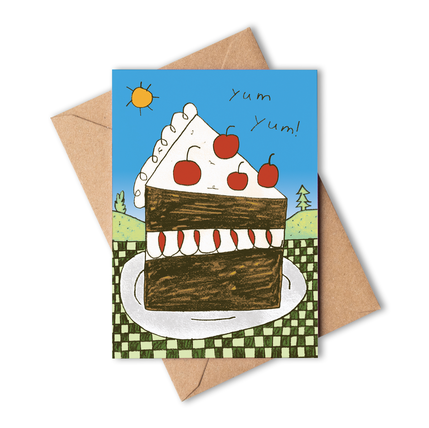 Indulge in birthday bliss with our 'Yum Yum!' greeting card! Delightfully adorned with a scrumptious birthday cake set against a picturesque countryside backdrop, it's the perfect recipe for sending sweet wishes.